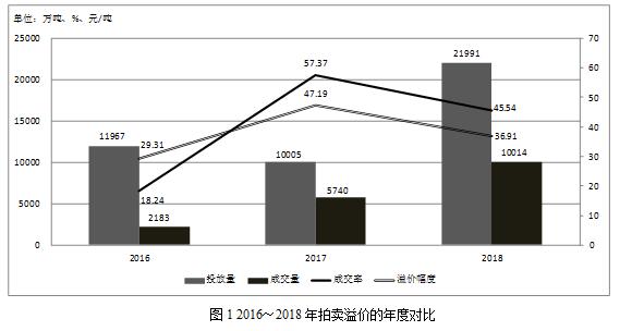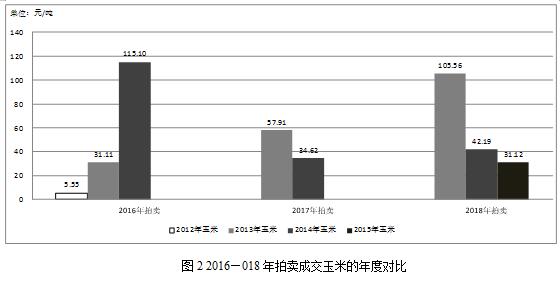 根据国家粮食交易中心公布数据,2016年临储玉米拍卖合计投放1.2亿吨,成交2183万吨,成交率18.24%,其中“跨省移库拍卖”成交量高达880万吨;从拍卖成交玉米生产年份看,2012 — 2014年产玉米成交量分别为729万吨、1054万吨和392万吨。2017年投放1亿吨,成交5746万吨,成交率57.37%,其中2013 年 和2014年产玉米成交量分别为2856万吨和2689万吨。2018年投放21991万吨,成交10014万吨,成交率45.54%,其中2014和2015年产玉米成交量分别为4838万吨和5119万吨。总体上,拍卖溢价的年度对比分析主要包括两个角度:一个是从拍卖角度对比分析不同拍卖年度之间的溢价,另一个是从玉米生产年份角度对比分析同一年份生产玉米在不同拍卖年度之间的溢价。